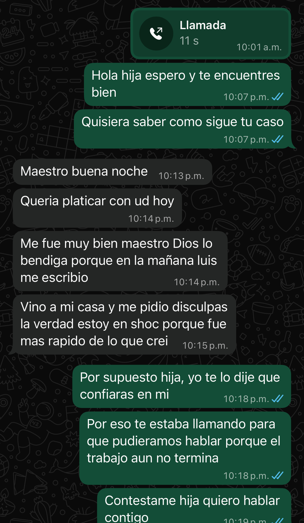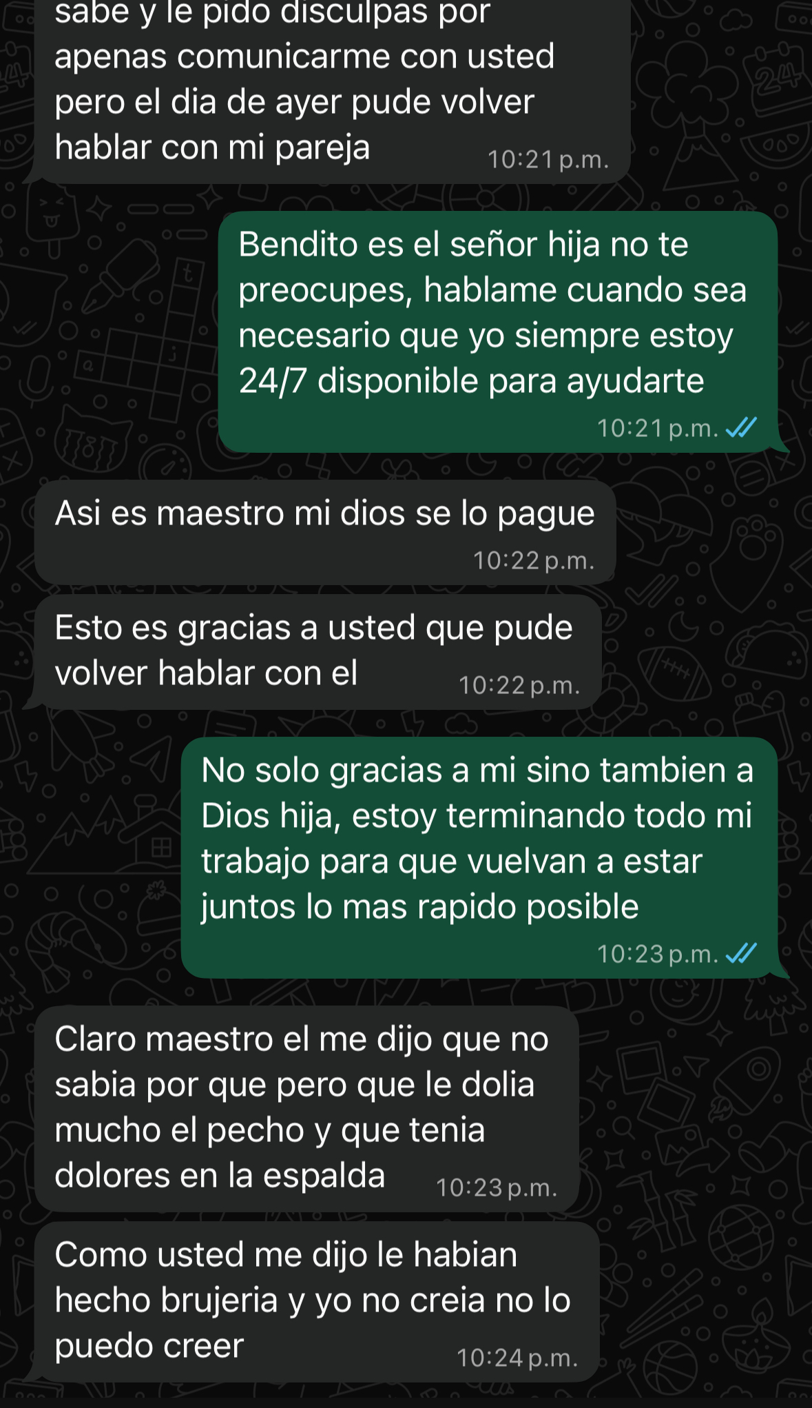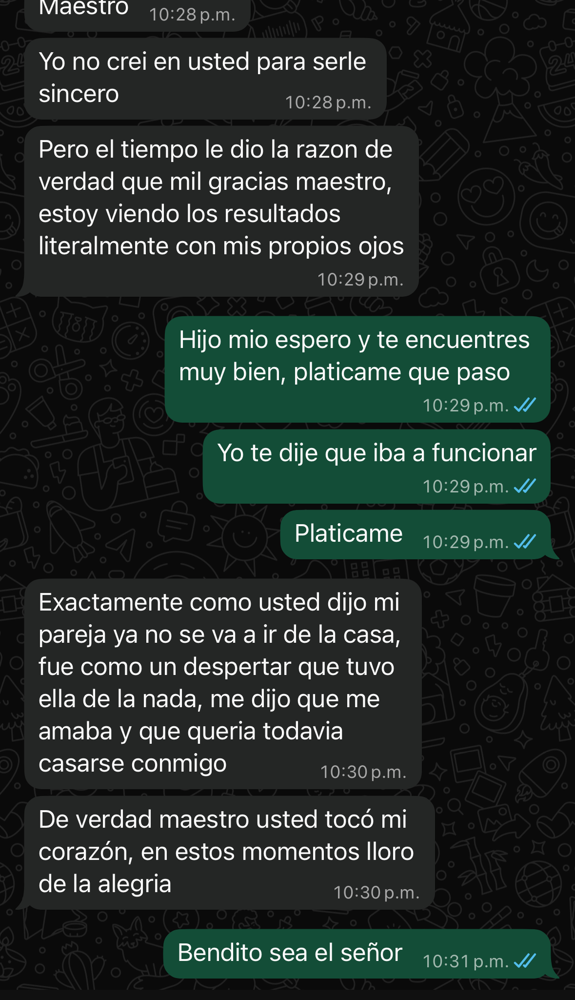Doy las gracias al maestro ezequiel porque pude fortalecer mis vinculos con mi pareja. Nos estabamos distanciando y notaba algunas conversaciones sospechosas con otra mujer que a fin de cuentas estaba haciendole brujeria a mi marido por simple desquite contra mi. Muchisimas gracias.